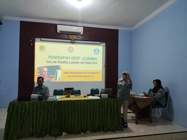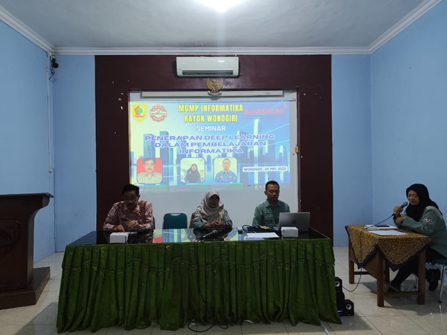 DALAM rangka peningkatan kompetensi guru di era transformasi digital, Musyawarah Guru Mata Pelajaran (MGMP) Informatika Kabupaten Wonogiri menyelenggarakan seminar bertajuk “Penerapan Deep Learning dalam Pembelajaran Informatika” pada Sabtu, 24 Mei 2025 bertempat di SMP Negeri 1 Wonogiri, mulai pukul 08.30 hingga 12.30 WIB. Kegiatan ini dihadiri oleh 50 peserta, yang terdiri dari guru Informatika jenjang SMP se-Kabupaten Wonogiri. Kegiatan seminar ini dipandu oleh moderator Oneke Asri Anggraheni, S.Kom. guru SMP Negeri 1 Wonogiri guru SMP Negeri 1 Wonogiri dan Yuni Sri Handayaningrum, ST serta Susanto, S.Kom sebagai narasumber. hadir juga ditengah tengah tamu undangan yaitu Drs. Rendro Mardiyanto, M.Pd. sebagai koordinator MGMP Informatika. Para peserta seminar kali ini adalah ibu bapak guru yang tergabung dalam kombel Mata Pelajaran Informatika Kabupaten Wonogiri. seperti pada umumnya seminar ini dibuka oleh moderator dan dilanjutkan dengan menyanyikan lagu Indonesia Raya yang dipimpin oleh Tri Rahayu Setyorini, S.Pd. Tak lupa pembacaan doa oleh Muh Ichsan, S.Pd. ketua MGMP Informatika Subrayon 05.