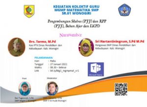 Kegiatan Kolektif Guru pertemuan pertama pada Rabu, 27 Januari 2021 dengan nara sumber Drs. Tarmo, M.Pd dan Sri Hartantiningrum, S.Pd, M.Pd. Kegiatan pertama diawali dengan prakata dari Ketua MGMP Sub Rayon 01 Gatot Wibowo, S.Pd menyampaikan bahwa kegiatan KKG ini adalah merupakan kegiatan rutin MGMP yang dilaksanakan oleh guru-guru matematika Sub Rayon 01 yang pelaksanaannya setiap hari Rabu, diharapkan untuk mengikuti kegiatan ini secara daring di microsoft office 365 aplikasi teams. Kegiatan pada pertemuan pertama ini akan membahas tentang Pengembangan Silabus, RPP dan LKPD. Sambutan oleh Widodo, S.Pd selaku Koordinator MGMP Matematika Sub Rayon 01, beliau mengatakan bahwa diharapkan semua guru di Sub Rayon 01 Wonogiri untuk dapat mengikuti kegiatan KKG untuk memotivasi pengembangan keprofesian guru dalam kariernya. Materi pertama disampaikan Drs. Tarmo, M.Pd. Beliau menyampaikan bahwa kita sebagai tenaga pendidik dalam mengembangkan keprofesian berkelanjutan yaitu mengikuti kegiatan pengembangan diri dengan mengikuti diklat fungsional, publikasi ilmiah, karya inovatif dan dengan aktif mengikuti Kegiatan Kolektif Guru yaitu dengan mengikuti kegiatan pada MGMP. Materi pengembangan silabus, RPP dan LKPD dikupas tuntas oleh Sri Hartantiningrum, S.Pd, M.Pd. Silabus yang terinclude dalam dokumen II kurikulum yang disesuaikan dengan Permendukbud no 61 tahun 2014. RPP merupakan dokumen III pada kurikulum disesuaikan dengan silabus yang disusun oleh guru. Setelah menyelesaikan kegiatan ini, peserta KKG diharapkan dapat menyusun silabus, RPP dan LKPD PJJ sesuai dengan pembagian tugas per sekolah, kemudian akan di presentasikan pada KKG pertemuan kedua.