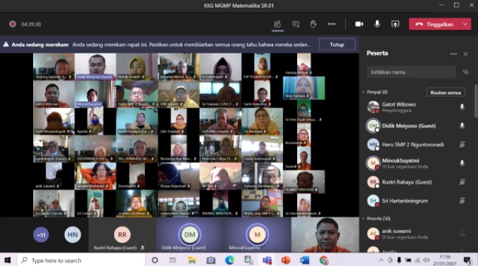 Di masa pandemi covid-19 ini MGMP Matematika Sub Rayon 01 telah menyelesaikan Kegiatan Kolektif Guru (KKG) paket 1 Pengembangan Silabus, RPP, Bahan Ajar dan LKPD PJJ untuk mendukung Pengembangan Keprofesian Berkelanjutan (PKB). Kegiatan Kolektif Guru ini merupakan bagian dari 7 paket KKG yang diprogramkan oleh MGMP Matematika SMP SR.01 Wonogiri. KKG pada paket pertama ini dilaksanakan 3 pertemuan yaitu tanggal 27 Januari 2021, 3 dan 10 Februari 2021. Kegiatan ini dilaksanakan secara daring dengan menggunakan Microsoft Office 365 aplikasi Teams.