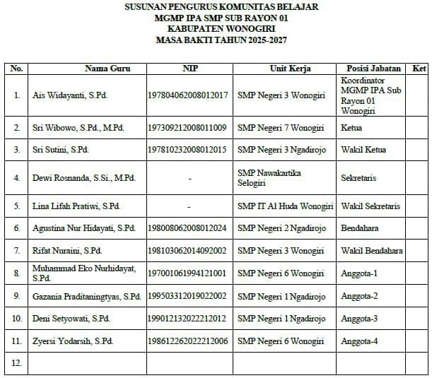 Dukungan penuh juga mengalir dari pengurus Rayon Kabupaten. Mewakili Ketua MGMP IPA Rayon Wonogiri, Sri Hartono, S. Pd. (SMPN 1 Selogiri) menyampaikan apresiasinya atas gerak cepat Sub Rayon 01. Beliau turut membawa kabar penting terkait perangkat ajar, yakni penyesuaian Buku Aktivitas Siswa (BAS) semester genap.