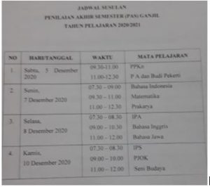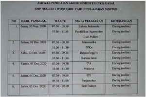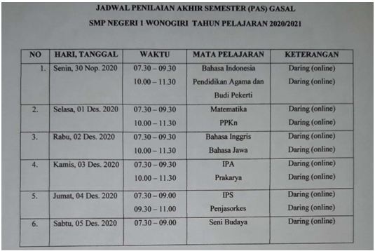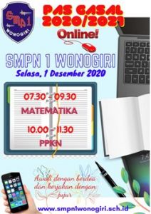 Wonogiri : Penilaian Akhir Semester (PAS) Gasal Tahun Pelajaran 2020/2021 di SMP Negeri 1 Wonogiri dilaksanakan secara Daring/Online.  Hal ini dilakukan untuk mencegah timbulnya kerumunan di sekolah mengingat pandemi Covid-19 belum berakhir. Adapun Pelaksanaan PAS Gasal adalah mulai tanggal 30 Nopember sampai dengan 5 Desember 2020.