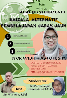 Musyawarah Guru Mata Pelajaran (MGMP) IPA SMP Subrayon 01 Wonogiri Kembali menyelenggarakan kegiatan koletif guru melalui Video Conference. Setelah sukses dengan kegiatan serupa sebelumnya yang mengusung tema Review RPP e-KTSP, kali ini Kembali dibuka room meeting memanfaatkan Microsoft Teams dengan mengambil tema Kaizala Alternatif Pembelajaran Jarak Jauh. Bertugas sebagai host, Sri Wibowo, S.Pd. guru SMP Negeri 7 Wonogiri dan Moderator Sri Purwaningsih Trisnowati, S.Pd., M.Pd. guru SMP Negeri 2 Selogiri (Sabtu 12-09-2020).