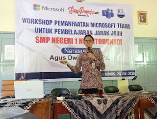 Atas pertimbangan tersebut, SMP Negeri 1 Nguntoronadi menyelenggarakan Workshop Pemanfaatan Microsoft Teams untuk Pembelajaran Jarak Jauh (Kamis, 23 Juli 2020). Kegiatan ini menghadirkan narasumber yang sangat mumpuni di bidangnya, Agus Dwianto, M.Pd (Guru SMPN 1 Baturetno, MIE Master Trainer, MIE Expert, Owner SangPengajar.com)